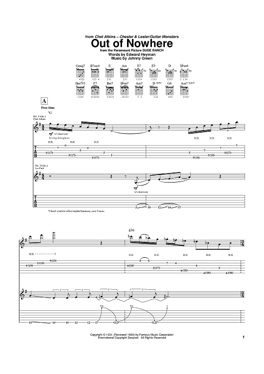 Digital Sheet Music for Out Of Nowhere by Django Reinhardt, Chet Atkins, Edward Heyman, Johnny Green, Les Paul scored for Guitar Tab; id:373330