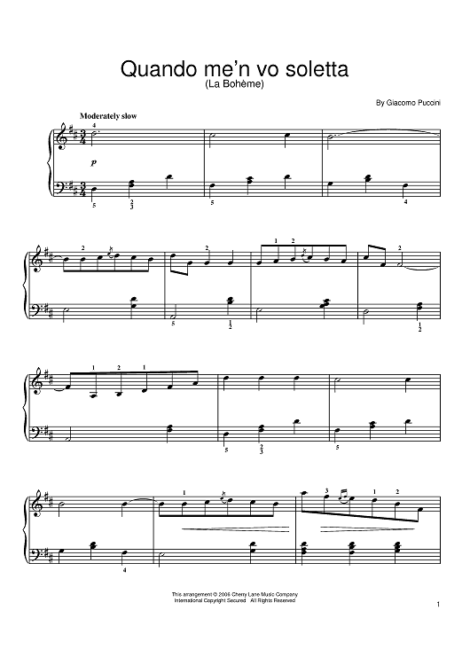Digital Sheet Music for Quando M'en Vo Soletta by Giacomo Puccini scored for Easy Piano; id:391286