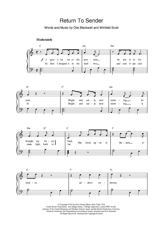 Digital Sheet Music for Return To Sender by Elvis Presley scored for Easy Piano; id:378700