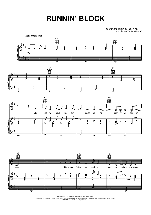 Digital Sheet Music for Runnin' Block by Scott Emerick, Toby Keith scored for Piano/Vocal/Chords; id:391847
