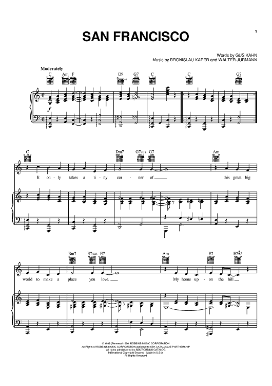 Digital Sheet Music for San Francisco by Judy Garland, Gus Kahn, Bronislau Kaper, Jeanette MacDonald, Walter Jurmann scored for Piano/Vocal/Chords; id:375234