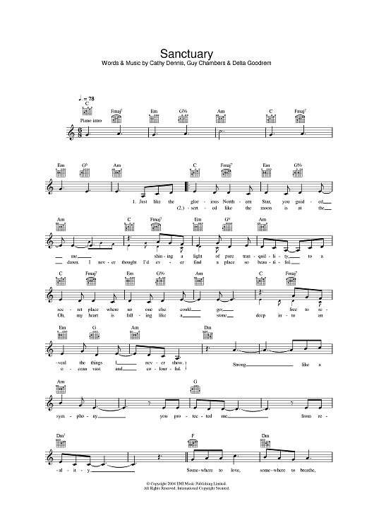 Digital Sheet Music for Sanctuary by Cathy Dennis, Guy Chambers, Delta Goodrem scored for Lead Sheet; id:382990