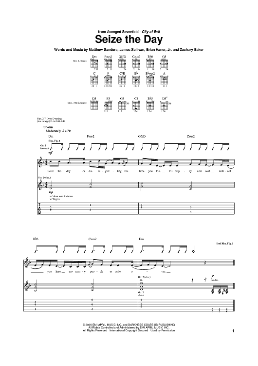Digital Sheet Music for Seize The Day by Avenged Sevenfold, Zachary Baker, Jr., Brian Haner, Matthew Sanders, James Sullivan scored for Guitar Tab; id:388759
