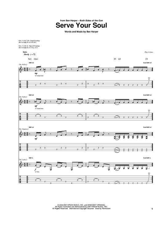 Digital Sheet Music for Serve Your Soul by Ben Harper scored for Guitar Tab; id:390089