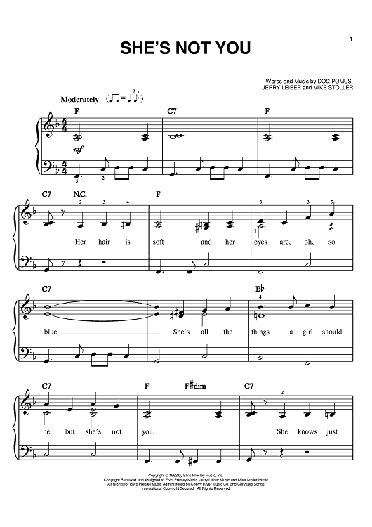 Digital Sheet Music for She's Not You by Elvis Presley, Jerry Leiber, Mike Stoller, Doc Pomus scored for Easy Piano; id:372899