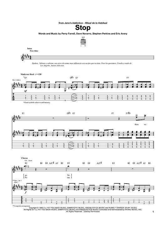 Digital Sheet Music for Stop by Perry Farrell, Jane's Addiction, Dave Navarro, Stephen Perkins scored for Guitar Tab; id:373662