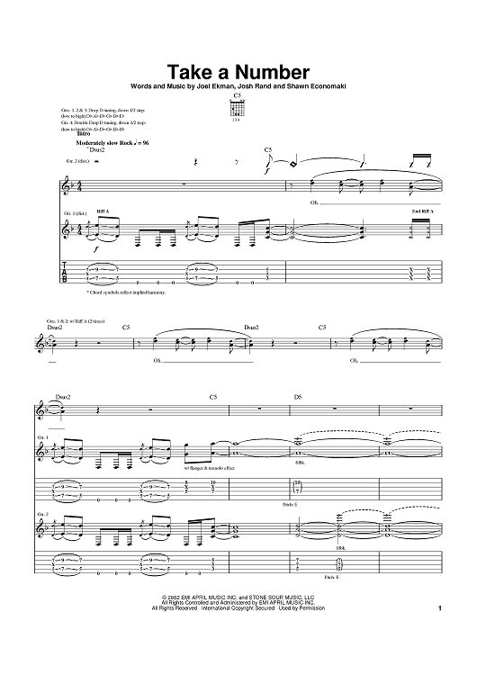 Digital Sheet Music for Take A Number by Shawn Economaki, Joel Ekman, Josh Rand, Stone Sour scored for Guitar Tab; id:370757