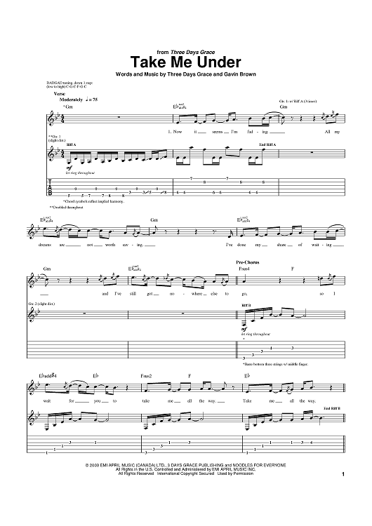 Digital Sheet Music for Take Me Under by Golden Brown, Three Days Grace scored for Guitar Tab; id:373636