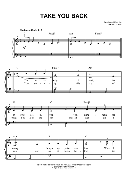 Digital Sheet Music for Take You Back by Jeremy Camp scored for Easy Piano; id:386315