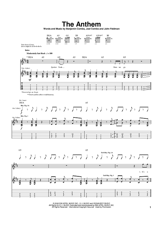 Digital Sheet Music for The Anthem by Benji Madden, Joel Madden, Good Charlotte, John Feldman scored for Guitar Tab; id:371009