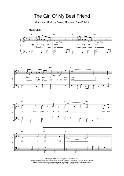 Digital Sheet Music for The Girl Of My Best Friend by Elvis Presley, Beverly Ross scored for Easy Piano; id:379636