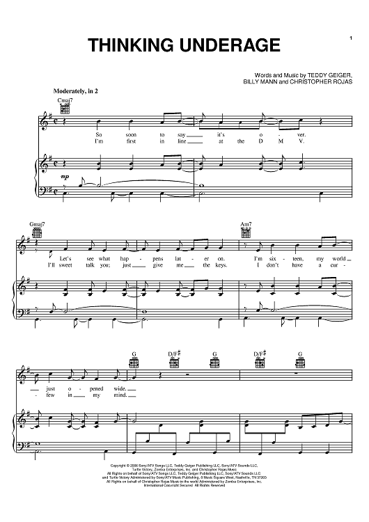 Digital Sheet Music for Thinking Underage by Billy Mann, Teddy Geiger, Christopher Rojas scored for Piano/Vocal/Chords; id:392269