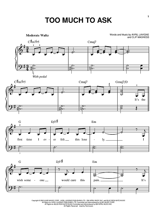 "Too Much To Ask" Sheet Music by Avril Lavigne