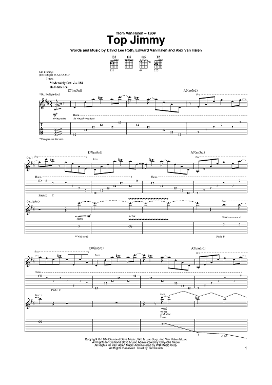 Digital Sheet Music for Top Jimmy by Eddie Van Halen, David Lee Roth, Alex Van Halen, Van Halen scored for Guitar Tab; id:385954