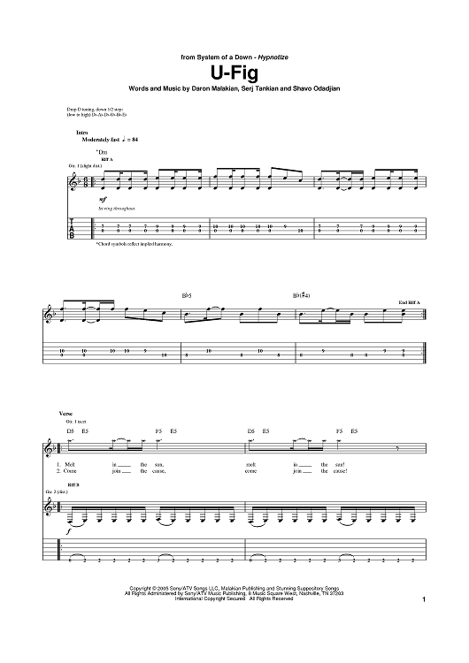 Digital Sheet Music for U-Fig by Daron Malakian, Shavo Odadjian, System Of A Down, Serj Tankian scored for Guitar Tab; id:389433