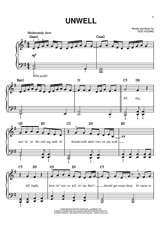 Digital Sheet Music for Unwell by Matchbox Twenty, Rob Thomas scored for Easy Piano; id:372720