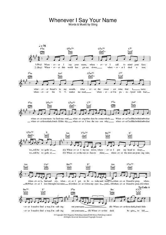 Digital Sheet Music for Whenever I Say Your Name by Sting scored for Lead Sheet; id:378174
