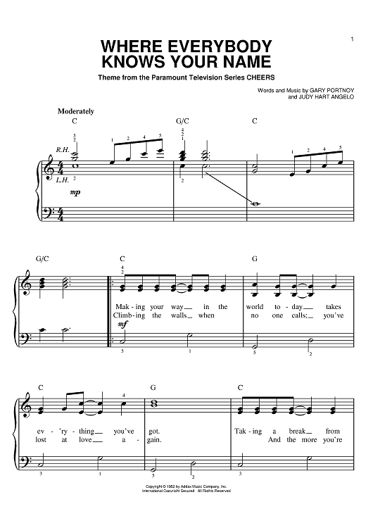 Digital Sheet Music for Where Everybody Knows Your Name by Gary Portnoy, Judy Hart Angelo scored for Easy Piano; id:385325