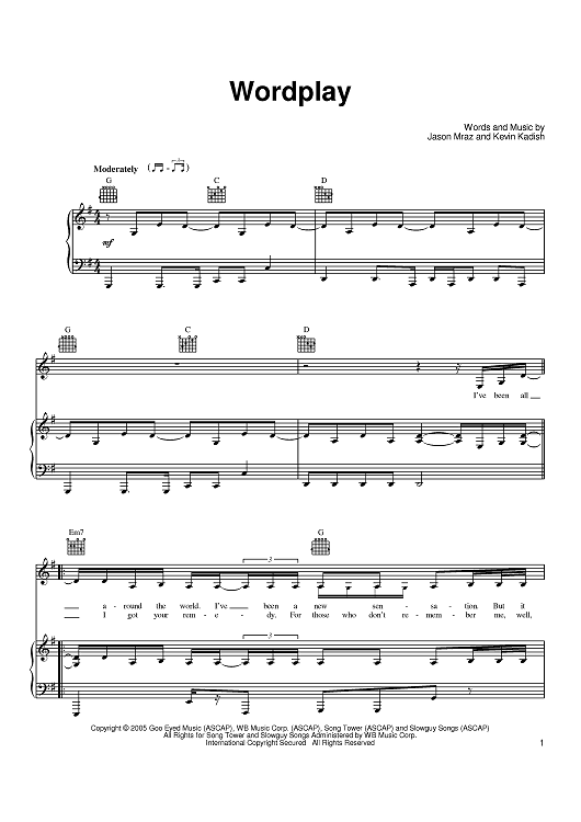 Digital Sheet Music for Wordplay by Kevin Kadish, Jason Mraz scored for Piano/Vocal/Chords; id:389109