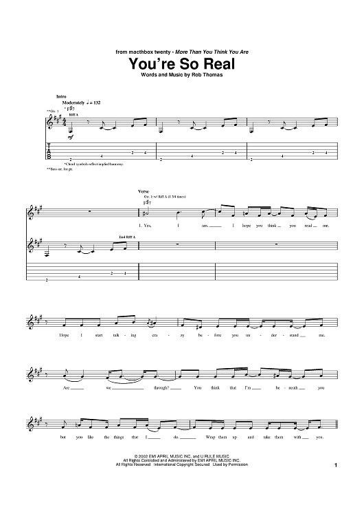 Digital Sheet Music for You're So Real by Matchbox Twenty, Rob Thomas scored for Guitar Tab; id:372478