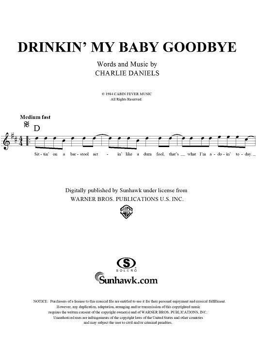 "Drinkin' My Baby Goodbye" Sheet Music by Charlie Daniels Band