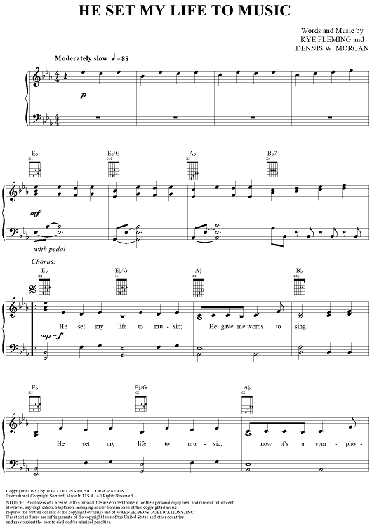 Digital Sheet Music for He Set My Life to Music by Kye Fleming, Dennis W. Morgan scored for Piano/Vocal/Chords; id:269795
