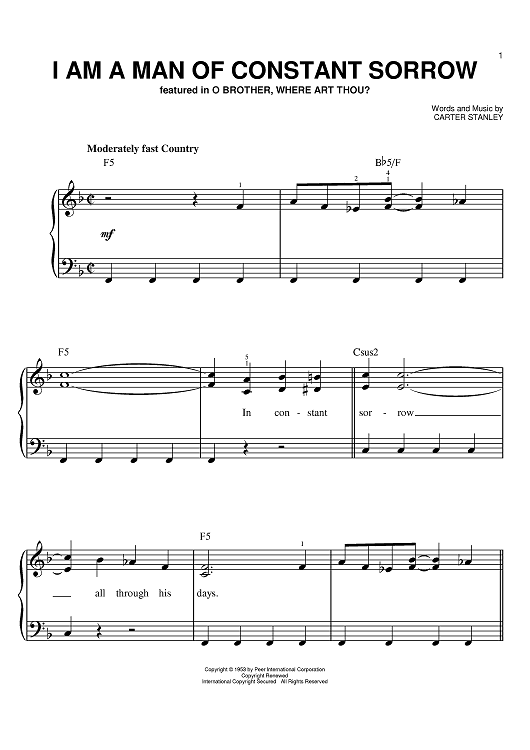 Digital Sheet Music for I Am A Man Of Constant Sorrow by Carter Stanley, The Soggy Bottom Boys scored for Easy Piano; id:372399