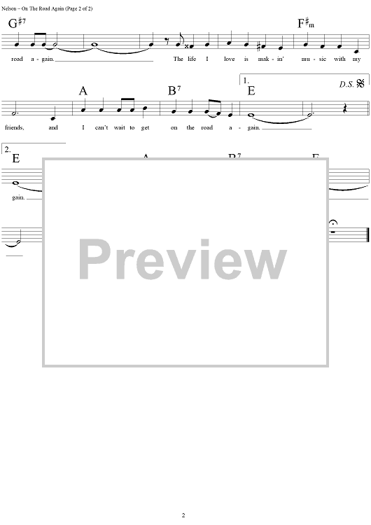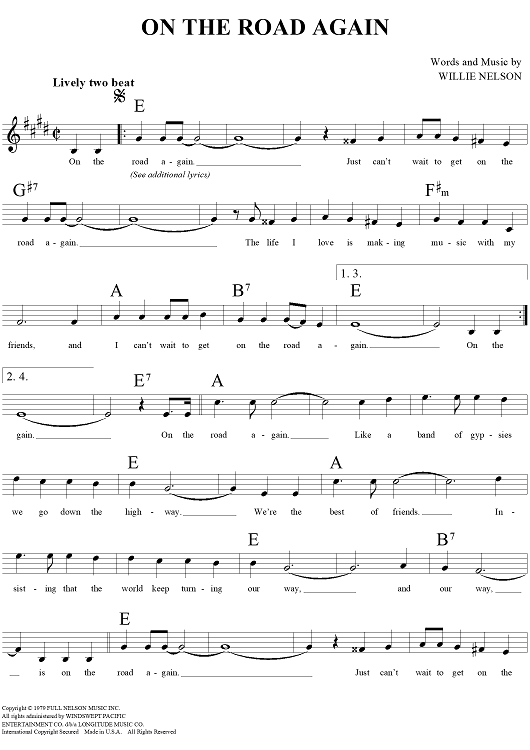 Digital Sheet Music for On The Road Again by Willie Nelson scored for Lead Sheet; id:116517