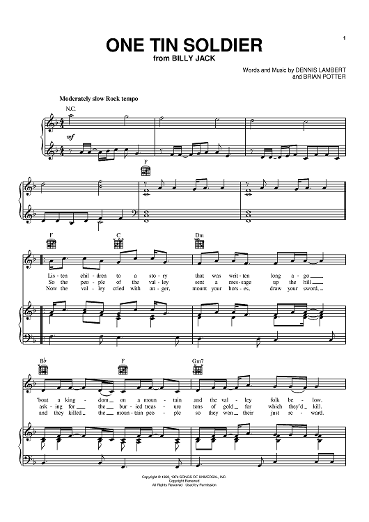 Digital Sheet Music for One Tin Soldier by Dennis Lambert, Brian Potter, Coven scored for Piano/Vocal/Chords; id:383044