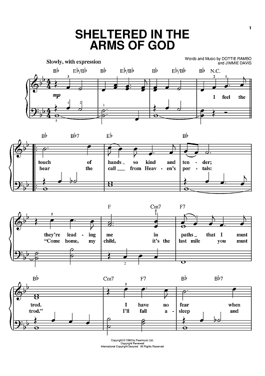 Digital Sheet Music for Sheltered In The Arms Of God by Jimmie Davis, Dottie Rambo scored for Easy Piano; id:367583