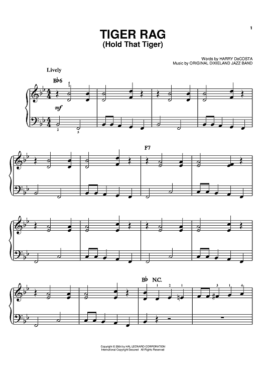 Digital Sheet Music for Tiger Rag (Hold That Tiger) by Harry DeCosta, Original Dixieland Jazz Band scored for Easy Piano; id:373879