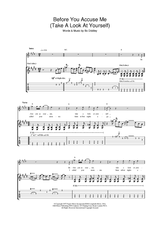Digital Sheet Music for Before You Accuse Me (Take A Look At Yourself) by Eric Clapton, Ellas McDaniel, Creedence Clearwater Revival, Bo Diddley scored for Guitar Tab; id:376998