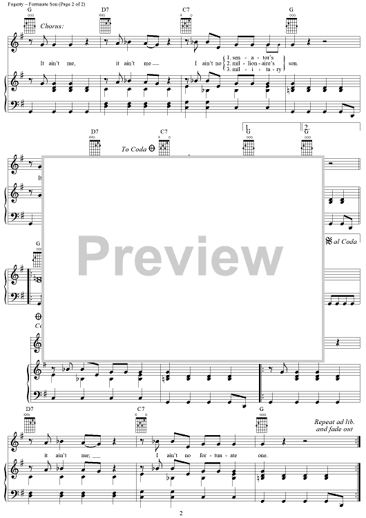 Digital Sheet Music for Fortunate Son by John Fogerty, Creedence Clearwater Revival scored for Piano/Vocal/Chords; id:269327