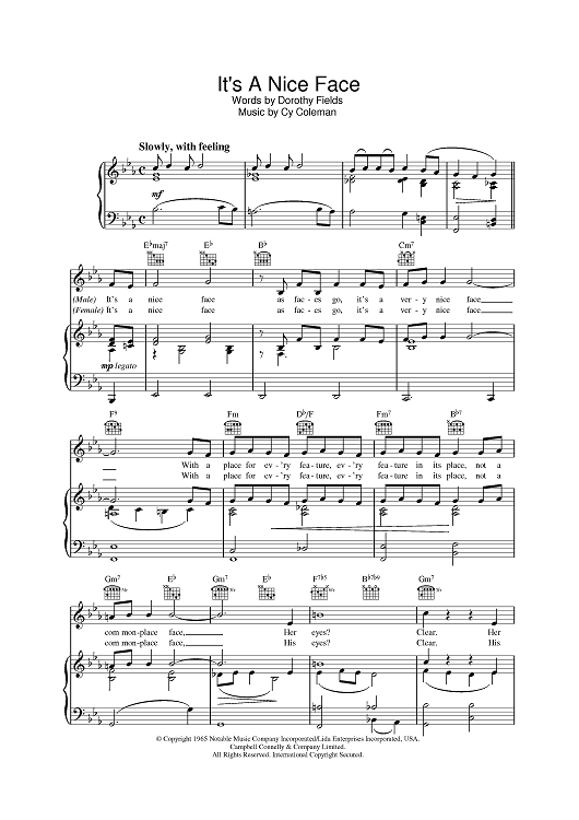 Digital Sheet Music for It's A Nice Face by Cy Coleman, Dorothy Fields scored for Piano/Vocal/Chords; id:388376