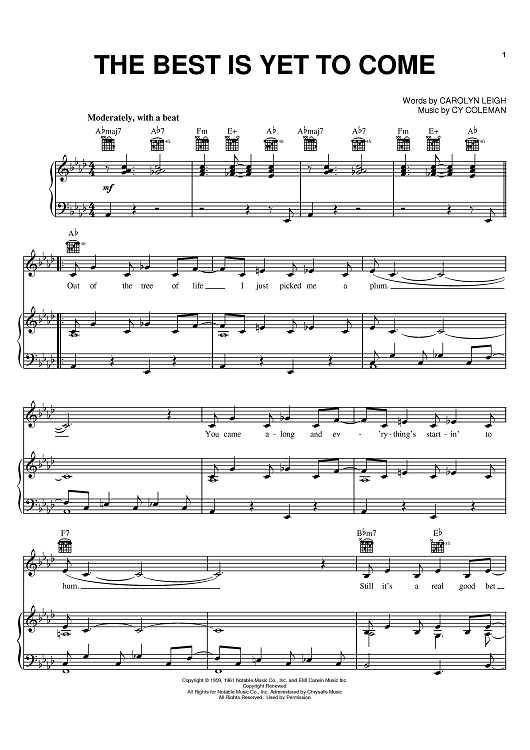 Digital Sheet Music for The Best Is Yet To Come by Frank Sinatra, Cy Coleman, Carolyn Leigh, Jon Secada, Tony Bennett, Diana Krall, Michael Buble scored for Piano/Vocal/Chords; id:394858
