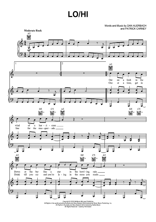 Digital Sheet Music for Lo/Hi by The Black Keys, Patrick Carney, Dan Auerbach scored for Piano/Vocal/Chords; id:467542