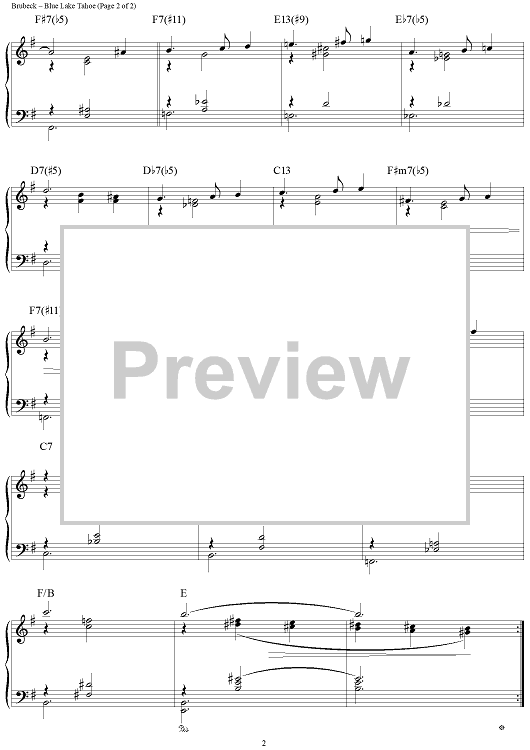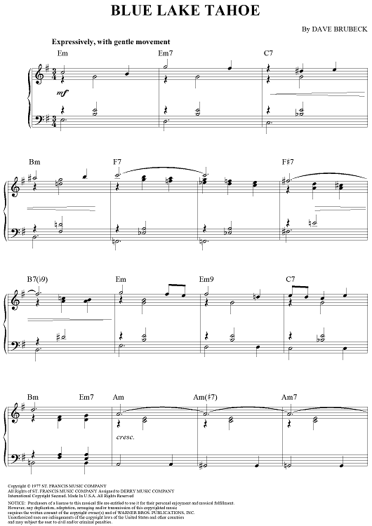 Digital Sheet Music for Blue Lake Tahoe by Dave Brubeck scored for Piano Solo; id:275831