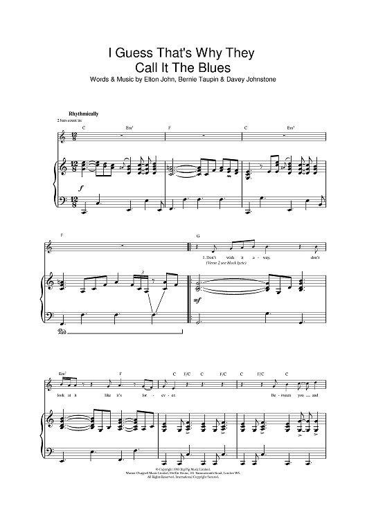 Digital Sheet Music for I Guess That's Why They Call It The Blues by Elton John, Bernie Taupin, Davey Johnstone scored for Piano/Vocal/Chords; id:385123