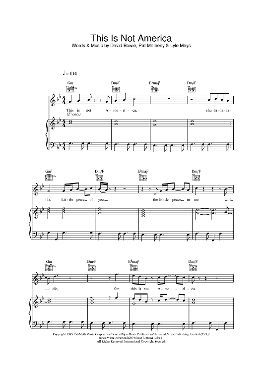 Digital Sheet Music for This Is Not America by David Bowie, Lyle Mays, Pat Metheny scored for Piano/Vocal/Chords; id:384748