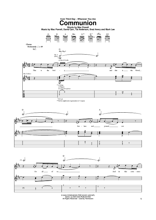 Digital Sheet Music for Communion by Third Day, Mac Powell, Mark David Lee, Tai Anderson, Brad Avery, David Carr scored for Guitar Tab; id:388575