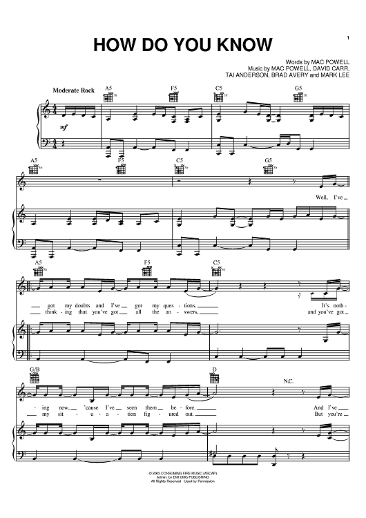Digital Sheet Music for How Do You Know by Third Day, Mac Powell, Mark David Lee, Tai Anderson, Brad Avery, David Carr scored for Piano/Vocal/Chords; id:388419