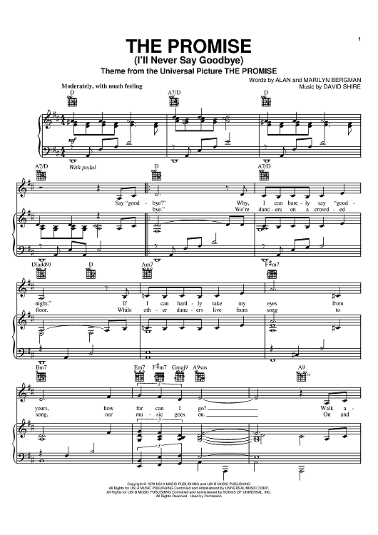 Digital Sheet Music for The Promise (I'll Never Say Goodbye) by Alan Bergman, Marilyn Bergman, David Shire, Rosemary Clooney scored for Piano/Vocal/Chords; id:402004