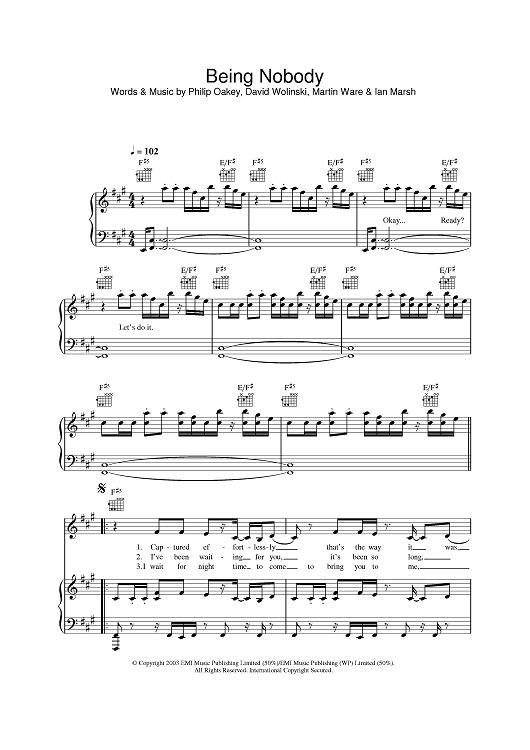 Digital Sheet Music for Being Nobody by Liberty X, Ian Marsh, Philip Oakey, Martin Ware, David Wolinski scored for Piano/Vocal/Chords; id:387839