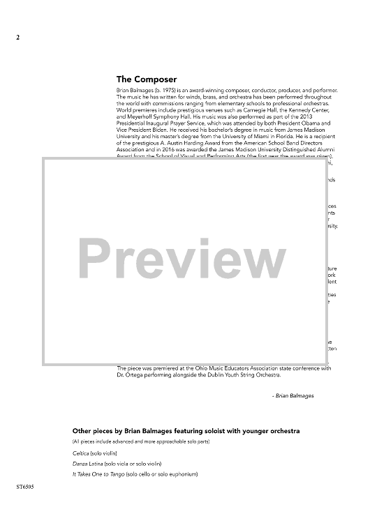 Feature a guest artist or star student in this piece that includes an advanced level violin solo along with a more approachable solo for the younger, yet ambitious student. Well within the technical grasp of young orchestras, the music is designed to allow the soloist to display both technique and lyricism as the piece moves through a series of “diversions” held together by a common theme. Inspiring for your students and your audience! (4:30)