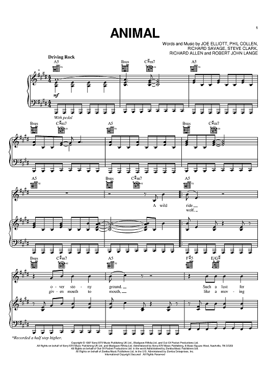 Digital Sheet Music for Animal by Steve Clark, Def Leppard, Robert Lange, Joe Elliott, Phil Collen, Richard Allen, Rick Savage scored for Piano/Vocal/Chords; id:388975