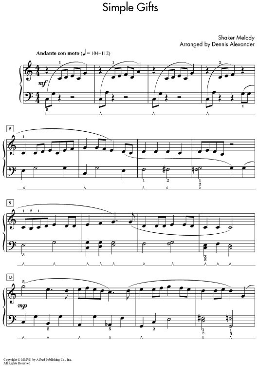 Digital Sheet Music for Simple Gifts by Shaker Melody, Dennis Alexander scored for Piano Solo; id:469128