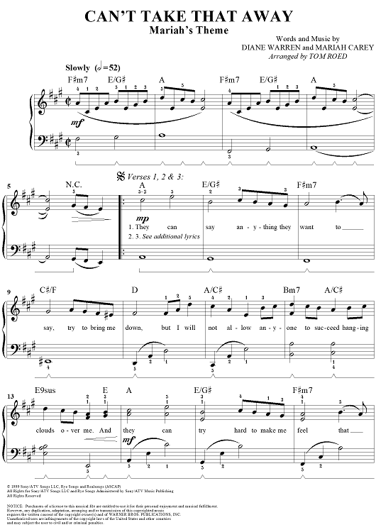 Digital Sheet Music for Can't Take That Away by Diane Warren, Mariah Carey, Tom Roed scored for Easy Piano/Vocal; id:289454