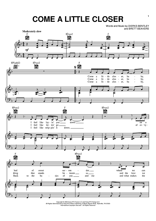 Digital Sheet Music for Come A Little Closer by Dierks Bentley, Brett Beavers scored for Piano/Vocal/Chords; id:386570