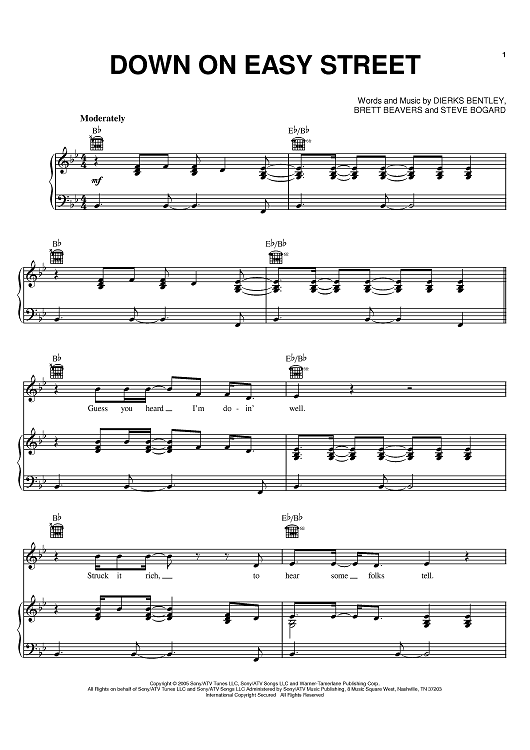 Digital Sheet Music for Down On Easy Street by Steve Bogard, Dierks Bentley, Brett Beavers scored for Piano/Vocal/Chords; id:388400