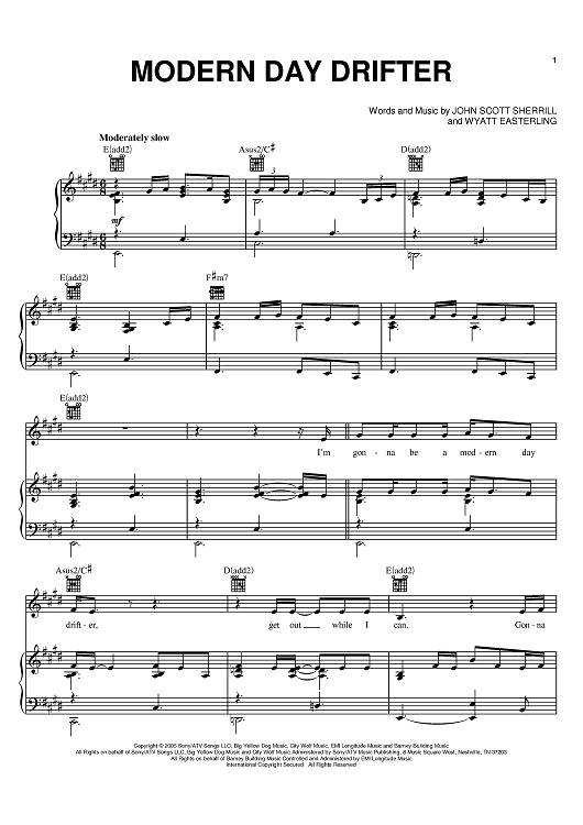 Digital Sheet Music for Modern Day Drifter by John Scott Sherrill, Dierks Bentley, Wyatt Easterling scored for Piano/Vocal/Chords; id:388401
